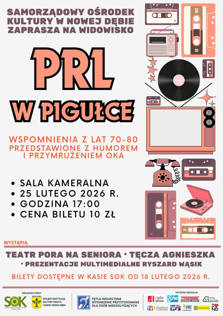2026-02-182026-02-18 Grzegorz LubasPosted in Aktualności Zapraszamy na widowisko w wykonaniu teatru pora na seniora, które przeniesie nas z humorem i przymrużeniem oka do lat 70-tych i 80-tych.Do czasów kiedy czekoladki były na kartki a aparat telefoniczny na poczcie, przeniosą nas aktorzy Teatru „Pora na Seniora”. 25 lutego 2026godz. 17:00sala kameralna SOKbilety w cenie 10zł dostępne w kasie SOK Serdecznie zapraszamy